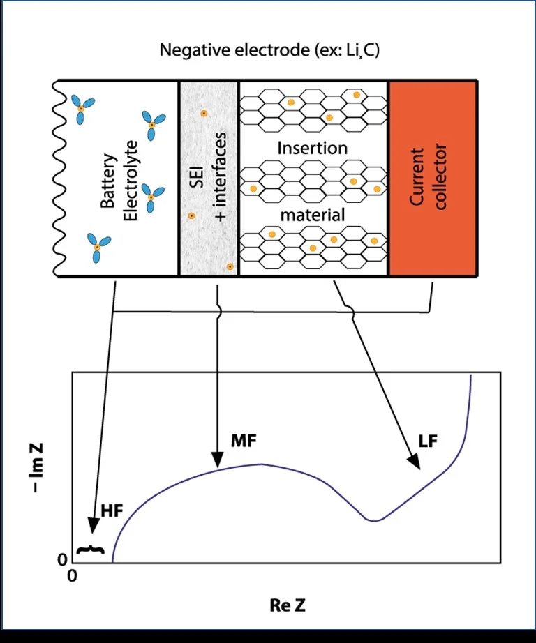 半電池的每個組件都可以進行表徵。在高頻下,可以測量電解質的歐姆電阻。在中頻下,可以獲得有關SEI電容和電子轉移速率的資訊。在低頻下,可以獲得有關插入材料中物質擴散過程的資訊。